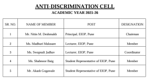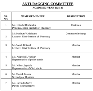 | Name- Mr.Nitin M. Deshmukh Designation- Principal Qualification- M.Pharm (Pharmaceutical Biotechnology) MBA, Ph.D Scholar. Industrial Experience- 9 years Academic Experience- 20 years Presentations : 10 Publications : 08 Membership in Scientific & Professional Societies: Association of Pharmaceutical Teachers of India (APTI) Indian Journal of Hospital Pharmacy (IJHP) Approved as external & internal examiner by MSBTE Appointed by MSBTE as Chairman of flying squad in MSBTE Examination. Appointed by MSBTE as Chairman of External Monitoring committee Chief Co-ordinator for 10 various State Level events |